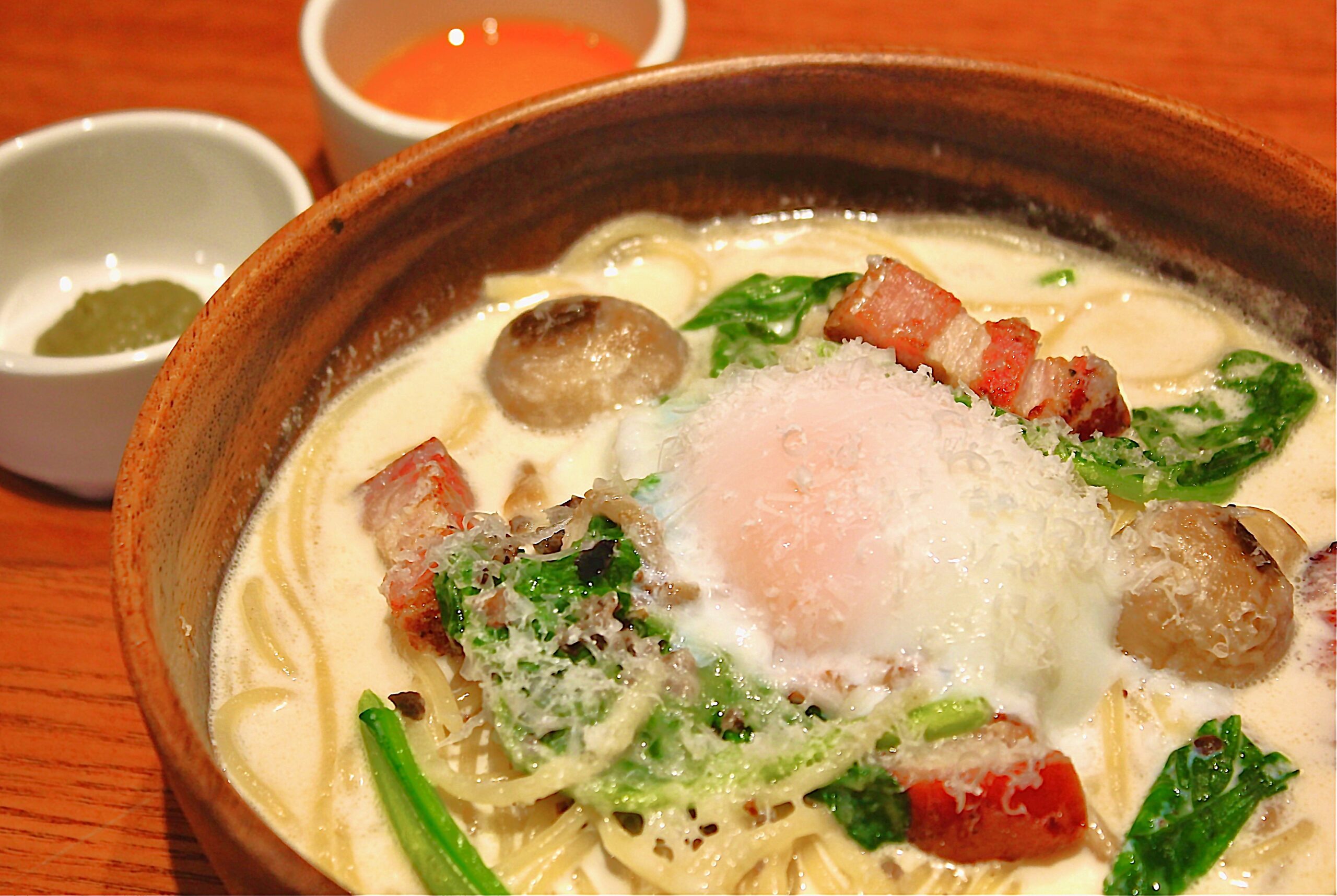【お知らせ】冬の新作メニュー 第2弾 お知らせ 2025.12.04 冬温まるクリーム仕立てのスープパスタ(温玉のせ)¥1,680-(税込み) ピカンテオイルでお好みの辛さに調節も良し、柚子胡椒で風味豊かに楽しむも良し。 パンビュッフェとの組み合わせNO.1。