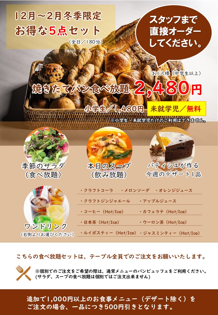 これまでの食べ放題に加え、【サラダ】【スープ】【デザート】【ドリンク】を付けたお得な5点セットが仲間入り。